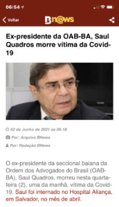 Conforme matéria veiculada pelo site BNews, o advogado e ex presidente da OAB/BA, Saul Quadros, faleceu na manhã desta quarta, vítima da COVID-19.